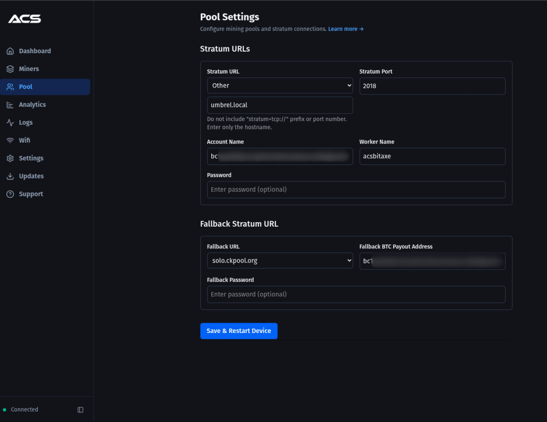 You may have the option to insert your Bitcoin address, but to be honest I skipped that part on the device and opted for the Web Interface to do so, because I wanted to configure my mining pool and other details.